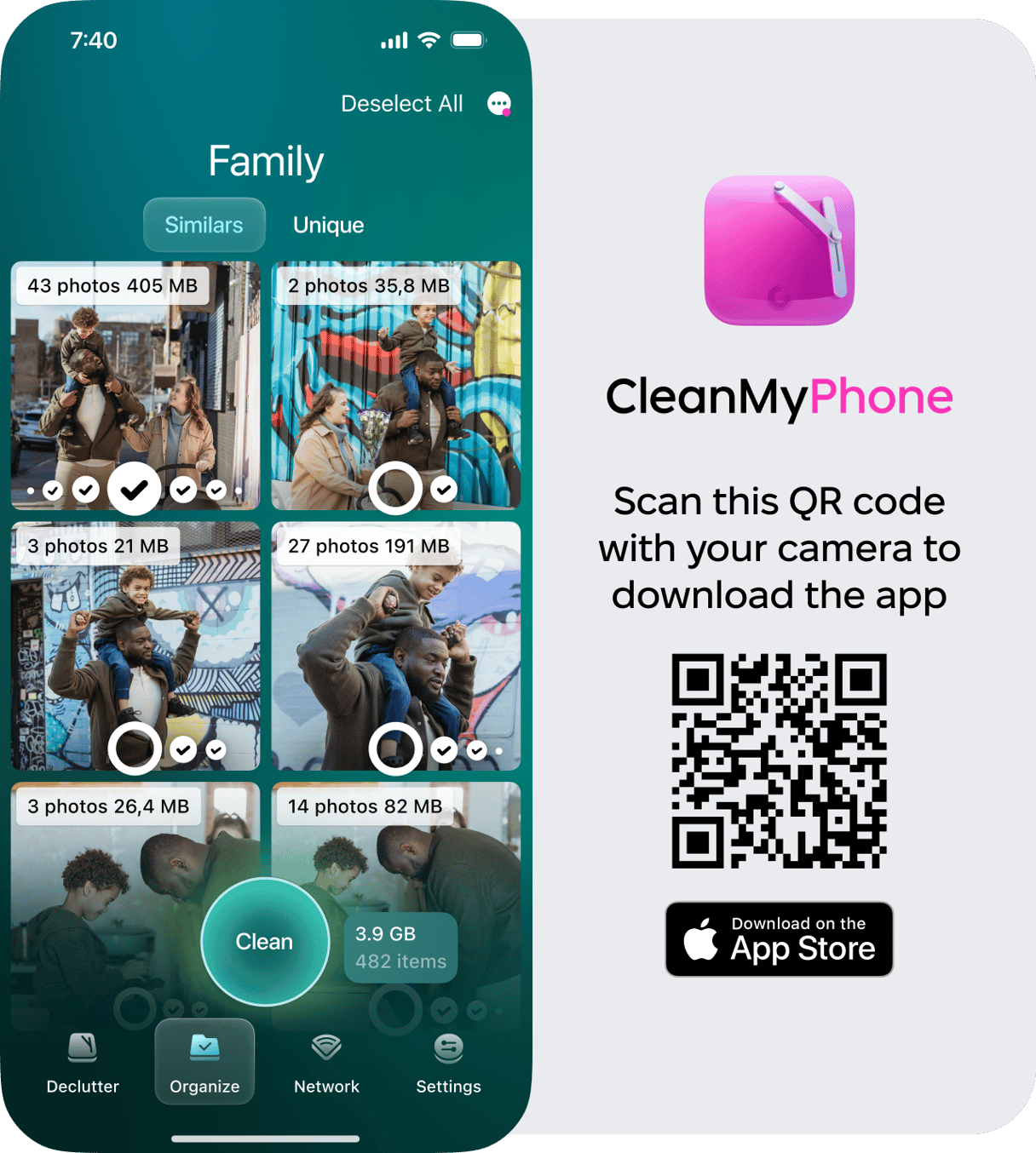 CleanMy®Phone av MacPaw er en smart iPhone-renser drevet av AI. Den skanner enheten din for rot som: