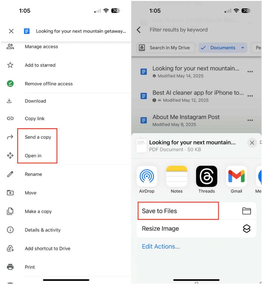Nedenfor viser vi deg flere måter å lagre Google Dokumenter på i Filer-appen på iPhone, inkludert hvordan du laster dem ned for offline tilgang eller konverterer dem til PDF-filer. Vi viser deg også hvor du finner de lagrede filene dine og hvordan du sletter dem når du går tom for plass.