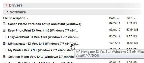 Trinn 3: Klikk på den blåProgramvarelenken, og klikk deretter påMP Navigator EX Ver. 3.14link.