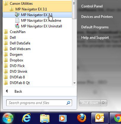 Trinn 1: Start Canon MP Navigator ved å klikke påStartknappen nederst til venstre på skjermen, klikkAlle programmer, klikk påCanon Utilitiesmappen, klikk deretter påCanon MP Navigator EXalternativ.