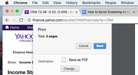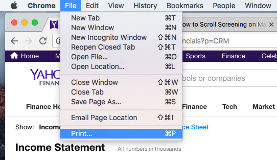 Anta at du vil trekke ut, for eksempel, et resultatregnskap fra Yahoo Finance. Først åpner du siden i en nettleser. Her bruker jeg Chrome på min Mac som eksempel.