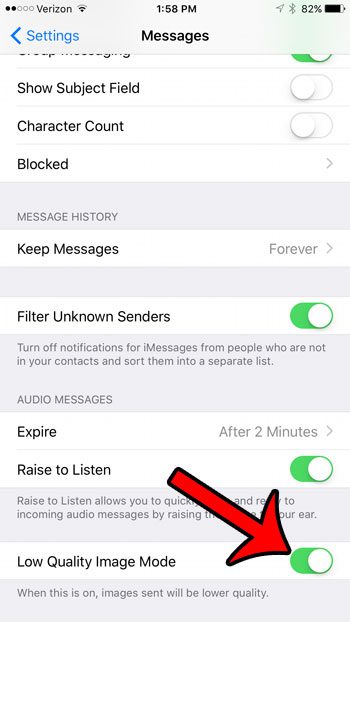 Trinnene nedenfor ble utført på en iPhone 7 Plus, i iOS 10. Når du har aktivert denne innstillingen, vil iPhone sende bilder av lavere kvalitet i iMessages. Dette vil redusere mengden data du bruker hvis du sender disse bildene mens du er koblet til et mobilnettverk.