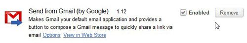 Hvis du ikke liker hvordan utvidelsen administrerer e-postaktivitetene dine i Chrome, kan du klikke påskiftenøkkelikonet øverst til høyre i vinduet, klikkVerktøy, og klikk deretterUtvidelser. Hvis du ikke lenger vil angi Gmail som standard, kan du klikke på boksen til venstre forAktivert, til høyre forSend fra Gmailutvidelse, for å fjerne haken. I tillegg kan du også slette utvidelsen ved å klikke påFjerneknapp.
