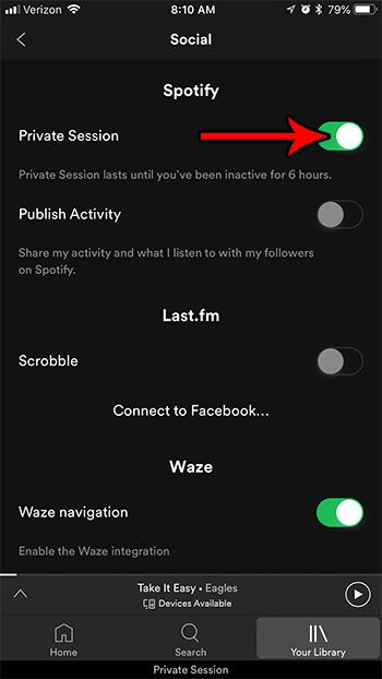 Nå som du vet hvordan du starter en privat økt i Spotify på en iPhone 7, vil du kunne finne og slå på dette alternativet når som helst du ikke vil at andre i Spotify skal kunne se hva du hører på.