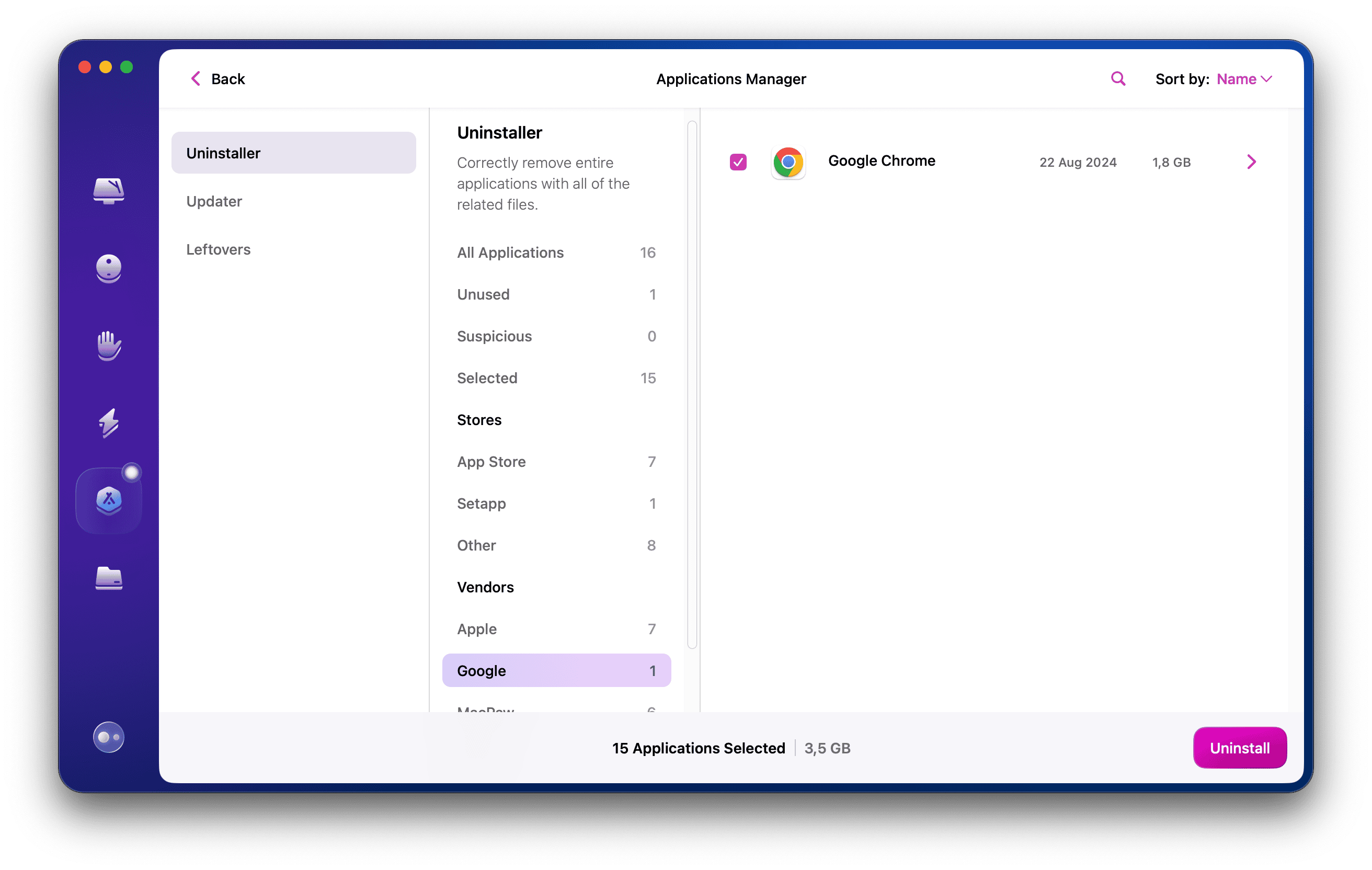 Den enkleste og raskeste måten å gjøre det på er å bruke et dedikert avinstalleringsprogram, som det i CleanMyMacs Applications-funksjon. Den kan avinstallere enhver tredjepartsapp og til og med slette flere apper samtidig. Det vil også fjerne filer som er igjen av andre apper som ikke ble avinstallert riktig.