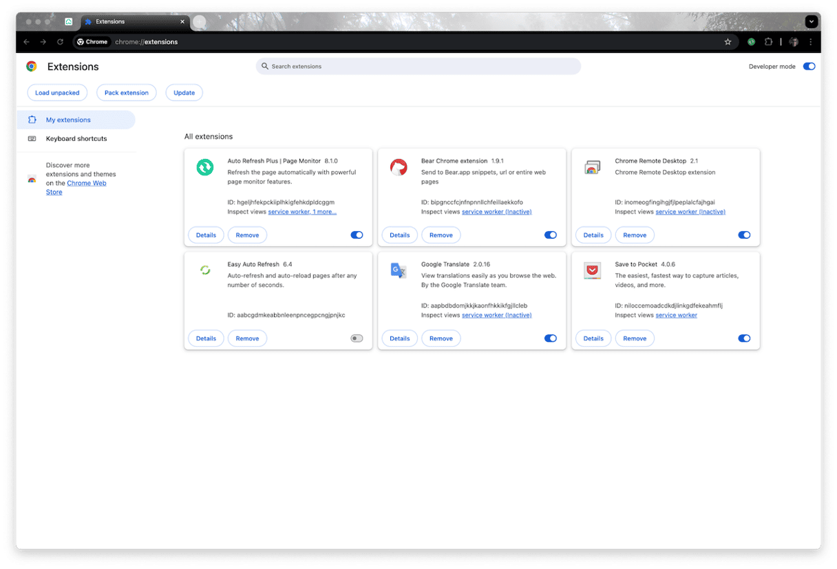 - Slå av alle utvidelser ved å bruke vippebryteren nederst til høyre på hver utvidelse.