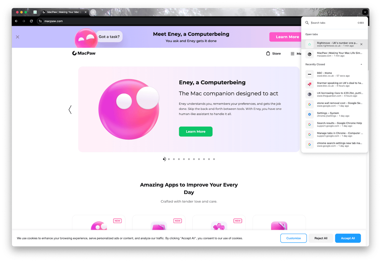 Å ha for mange nettleserfaner åpne er en vanlig årsak til at Mac kjører sakte eller blir ustabil. Hvorfor? Fordién Chrome-fane kan ta opp flere gigabyte med minne. Så det kan være veldig frustrerende hvis en nettleser automatisk åpner en ny fane hver gang du klikker på en lenke eller, i sjeldne tilfeller, når du ikke engang gjør det. I denne artikkelen viser vi deg hvordan du stopper åpning av tilfeldige faner i Chrome.