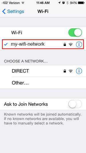 Du kan også sjekke Wi-Fi-tilkoblingen din ved å trykke påInnstillingerikonet på startskjermen, og trykk deretter påWi-Fialternativet øverst på skjermen. Det tilkoblede Wi-Fi-nettverket vil bli oppført øverst på denne skjermen, som i bildet nedenfor. Nettverket med det blå merket til venstre for det er det du er koblet til. Du kan også se en liste over andre Wi-Fi-nettverk som er innenfor rekkevidden til din iPhone.