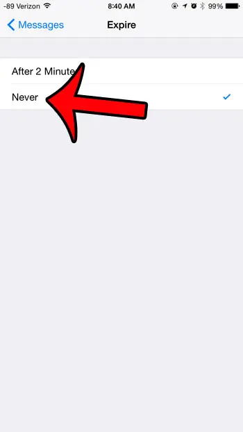 Vår guide fortsetter nedenfor med tilleggsinformasjon om hvordan du slår av automatisk sletting av meldinger på en iPhone, inkludert bilder for disse trinnene.