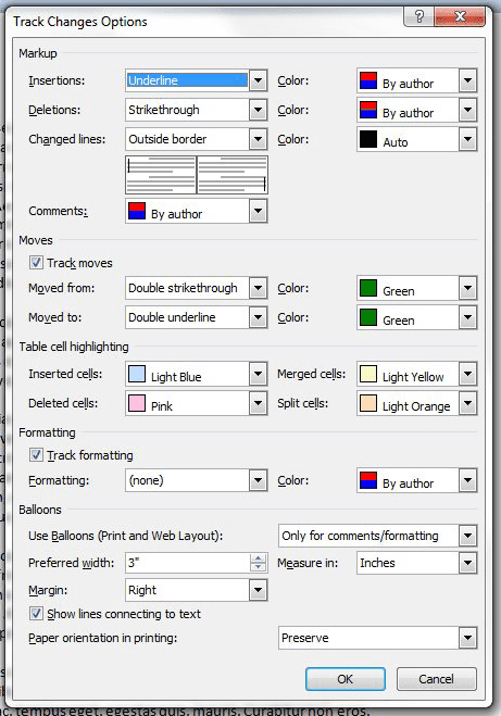 Dette vil gi deg menyen nedenfor, hvor du kan tilpasse hvordan endringene spores i dokumentet. Du kan klikke påOKnår du er ferdig med å justere alternativene i dette vinduet.