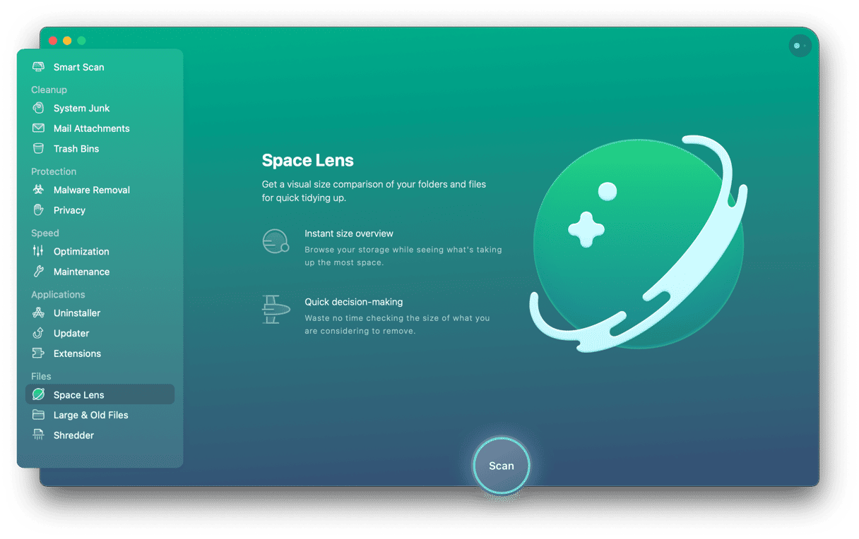 Du kan pålitelig få plassen og prosessorkraften som trengs for å forbedre Mac-ens ytelse ved å laste ned CleanMyMac. Den har Space Lens-verktøyet som kan bygge lagringskartet ditt i løpet av sekunder og vise deg alle filene og mappene på Mac-en.