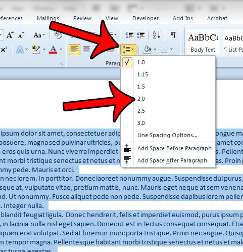 Vår veiledning fortsetter nedenfor med tilleggsinformasjon om hvordan du dobler plass i Word 2010, inkludert bilder av disse trinnene.