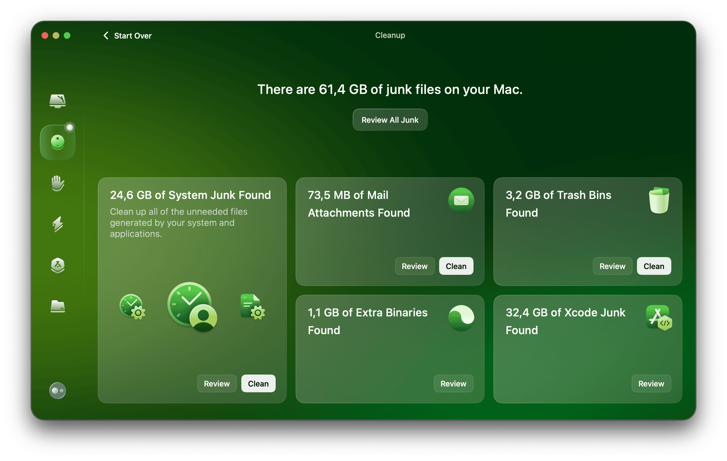 Enkel! Du har raskt fjernet ubrukelige systemlogger, hurtigbuffer, informasjonskapsler og ødelagte og midlertidige filer, noe som sparer plass og øker Macens produksjon.