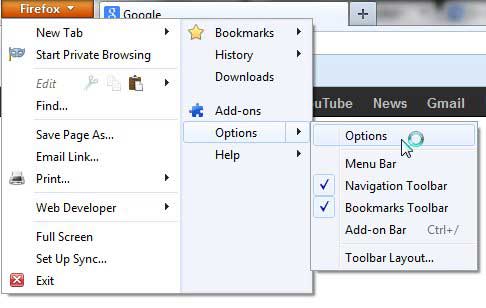 Trinn 2: Klikk påFirefoxfanen øverst til venstre i vinduet, klikkAlternativer, klikk deretterAlternativerigjen.