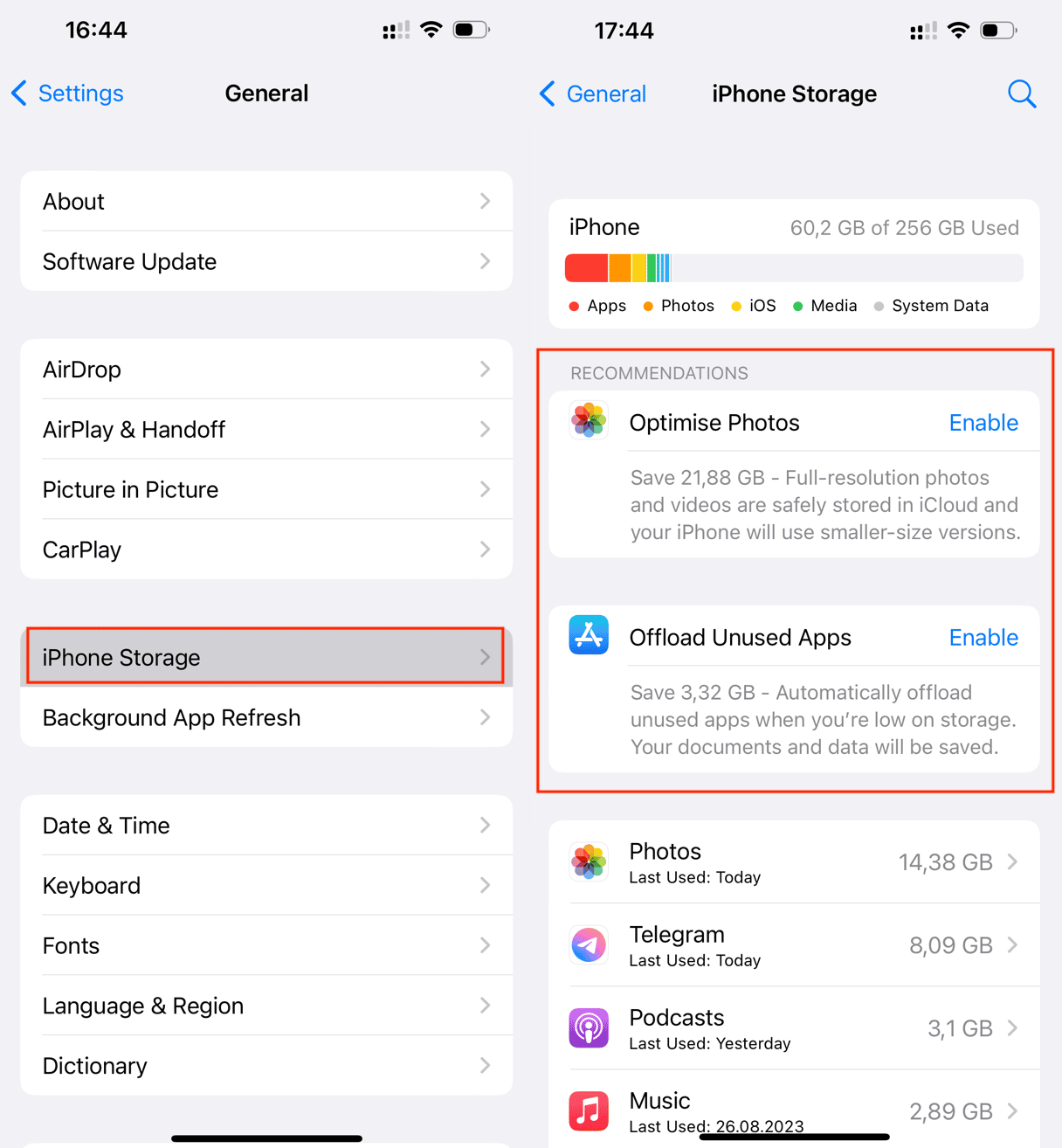 Hvis du bruker iPhone til å ta bilder og videoer, kan lagringen bli rotete på kort tid. Apple gjenkjenner problemet og foreslår noen raske handlinger som kan hjelpe deg med å optimalisere iPhone-lagringen. For å få tilgang til Apples anbefalinger, gå til Innstillinger > Generelt. Trykk her på iPhone-lagring og la den beregne dataene dine. Her er noen av anbefalingene du kan finne der: