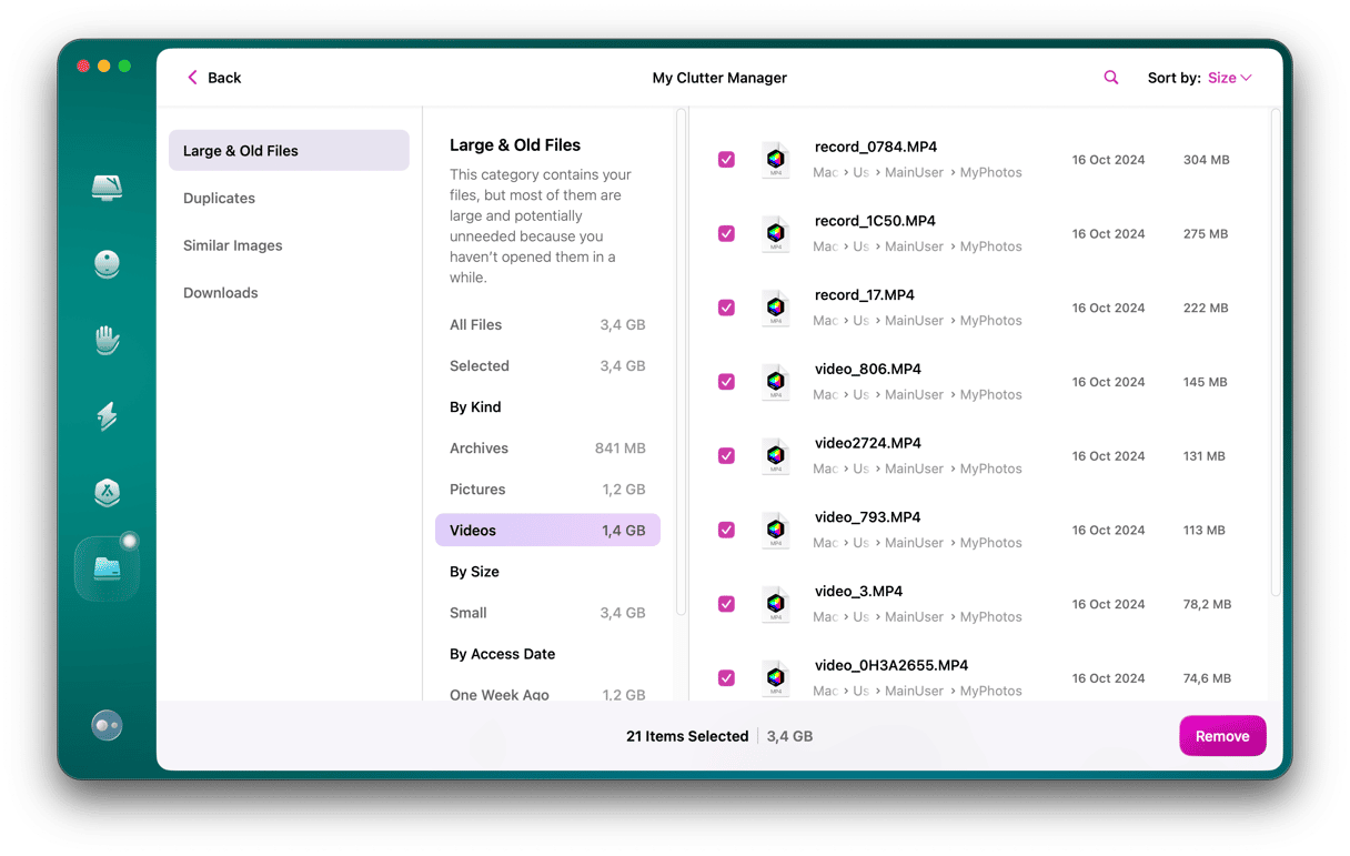 Selv om tipset ovenfor fungerer og er veldig nyttig, er det mye manuell graving, og det har begrensninger. Ærlig talt, jeg unngår vanligvis å skanne hele Macen min manuelt fordi det er for lett å gå glipp av ting som er begravet i obskure mapper. CleanMyMac kommer med en nyttig funksjon kalt My Clutter, som kan rense hele systemet på minutter, liste alle filer etter størrelse og type, og til og med sist åpnet for veldig enkel fjerning. Slik fungerer det: