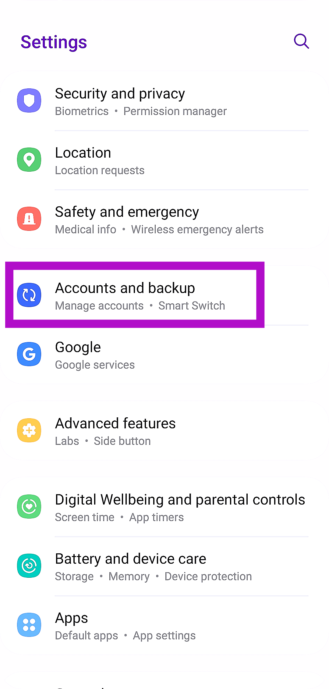 Trinn 1:Gå tilInnstillingerog velgKontoer og backup.