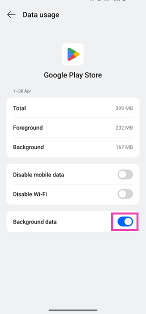 Gå tilInnstillinger>Apper>Google Play Butikk>Databrukog slå på vippebryteren ved siden av "Bruk bakgrunnsdata".