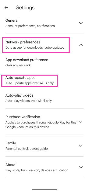 Trinn 3:Trykk påNettverkspreferanserog velgAutomatisk oppdatering av apper.