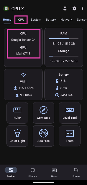 Tredjepartsapper: Det finnes et bredt utvalg av apper for enhetsinformasjon i Google Play-butikken som kan produsere alle nøkkelspesifikasjonene knyttet til enheten din. Apper som CPU X og CPU Info viser ikke bare navnet på brikkesettet i hjertet av enheten din, men også klokkehastighetene til dens individuelle kjerner.