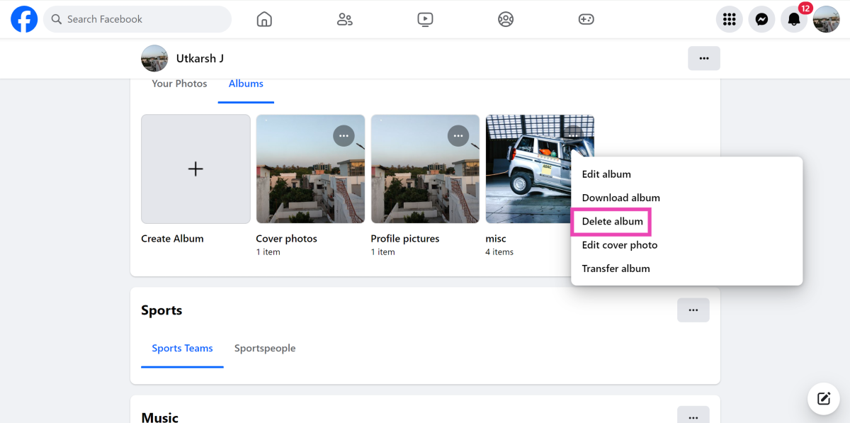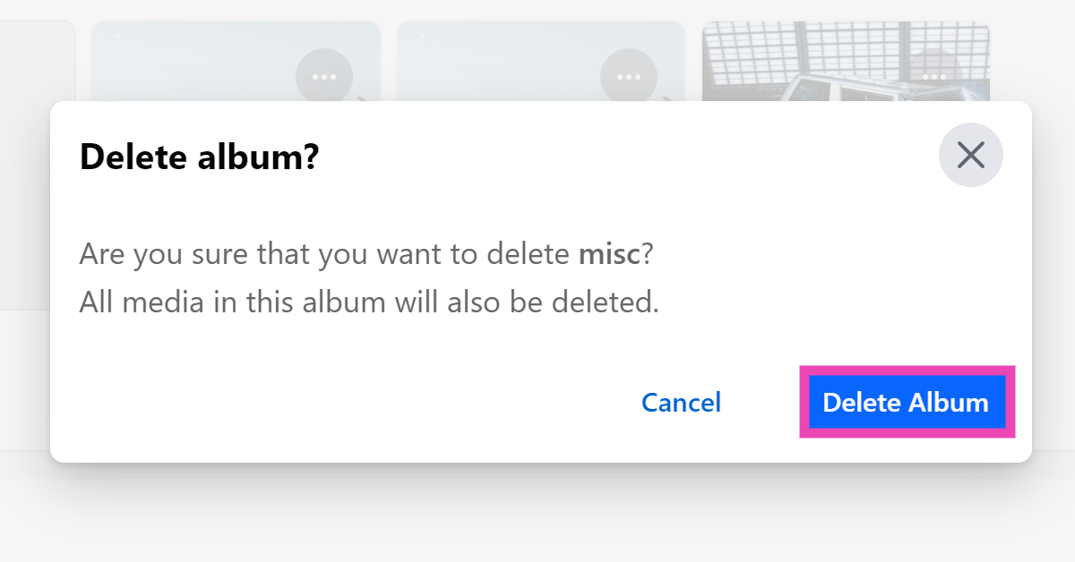 Gå tilProfil>Bilder, bytt til albumfanen, klikk på ellipsene på albumet du ønsker å slette og velg ‘Slett album’.