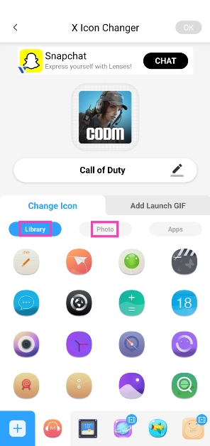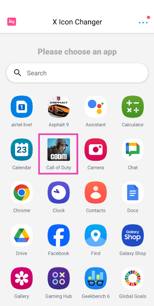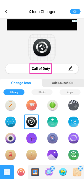 Last ned X Icon Changer-appen og velg appen du vil tilpasse fra listen. Du kan velge et bilde fra telefonens galleri for appikonet eller velge fra X Icon Changers bibliotek. Trykk på navnet på appen for å endre det.