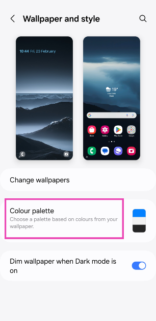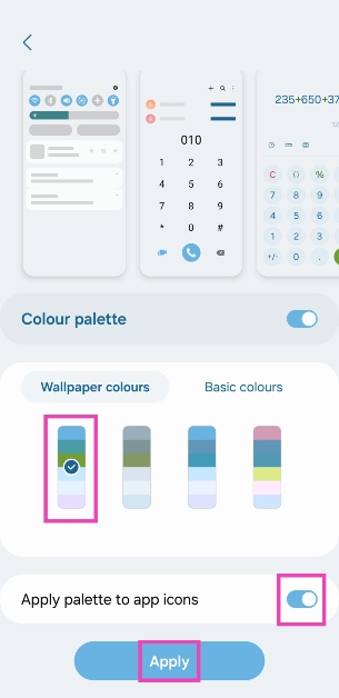 Gå tilInnstillinger>Bakgrunn og stil>Fargepalettog slå på vippebryterne for "Fargepalett" og "Bruk palett på appikoner". Velg en farge fra listen.