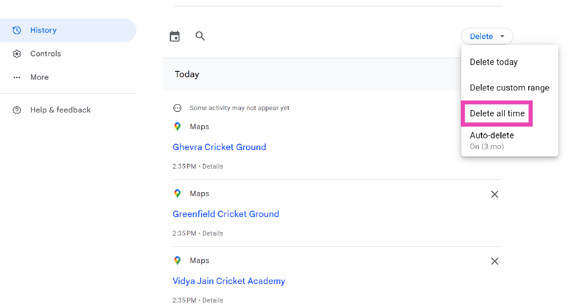 Gå til Google Maps ved å bruke nettleseren på PC-en din, klikk på hamburgermenyen, velg "Kartaktivitet", trykk på rullegardinmenyen som sier "Slett", og velg "Slett alle".