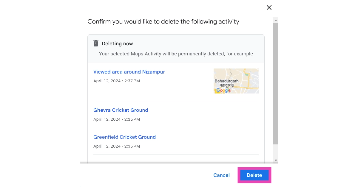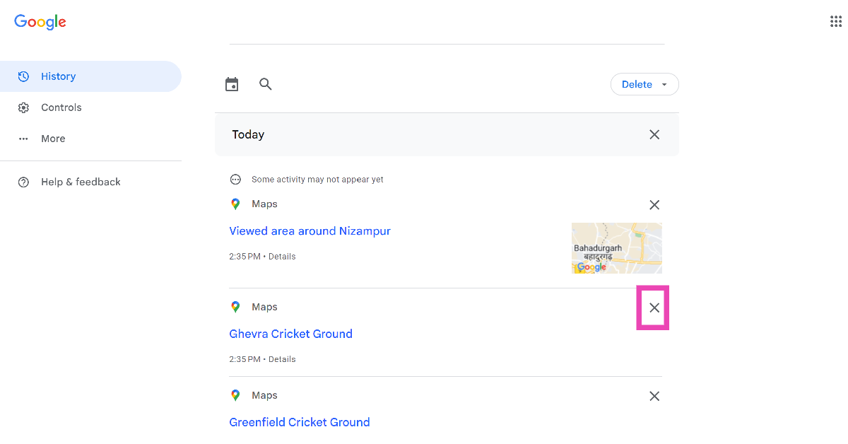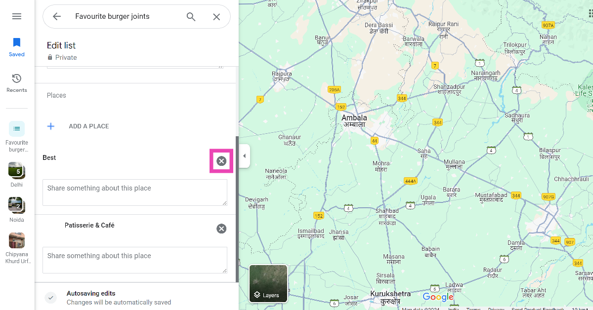 Trinn 5:Trykk påkryssikonved siden av et sted tilfjernedet fra Google Maps-loggen.