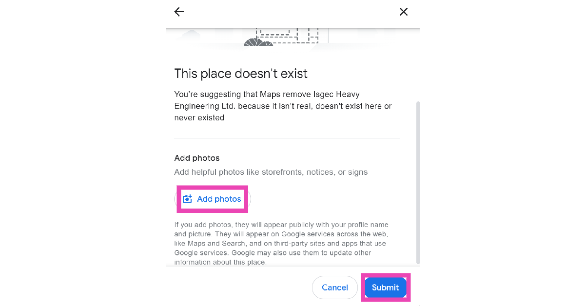 Google Maps lar deg redigere bedriftsadressen din eller helt fjerne den fra kartet. Bare personen som eier virksomhetsoppføringen kan utføre denne handlingen. Hvis du kommer over en virksomhet som er oppført på kartet, men som ikke lenger er funksjonell, kan du rapportere det til Google. Det samme kan gjøres for virksomheter som er oppført på feil plassering. Mens du foretar redigeringen, vil Google be deg om å supplere rapporten med bilder. Når informasjonen er bekreftet, vil bedriftens beliggenhet endres eller fjernes fra kartet.
