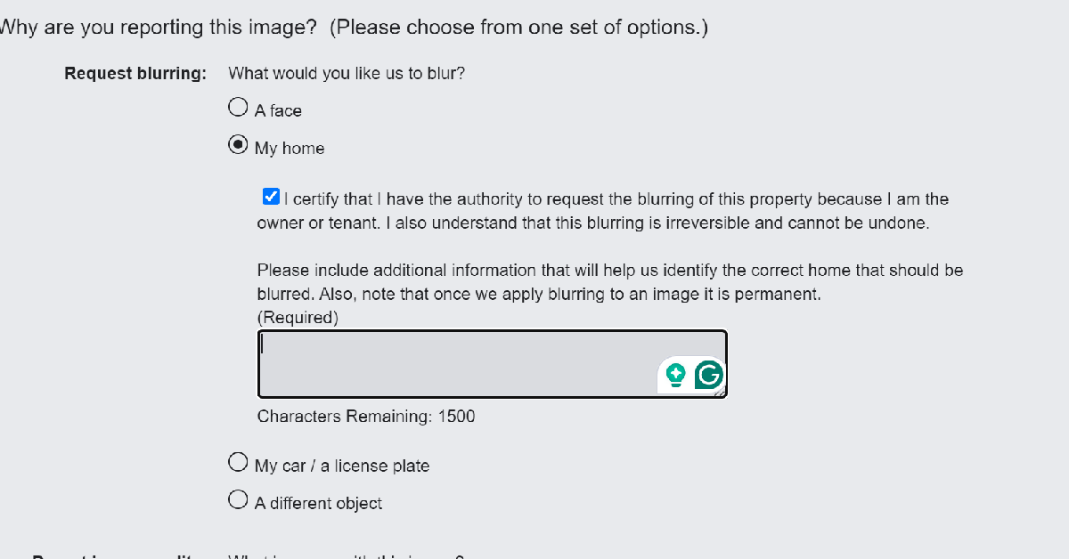 Mens du ikke kan fjerne et sted helt fraGoogle Street View, hvis du ikke vil at huset ditt skal vises der, kan du alltid sende en forespørsel om å gjøre det uskarpt. Når forespørselen er sendt, vil Google kontakte deg og bekrefte at du bor på stedet du har valgt.