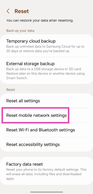 Trinn 3:VelgeTilbakestill mobilnettverksinnstillinger.