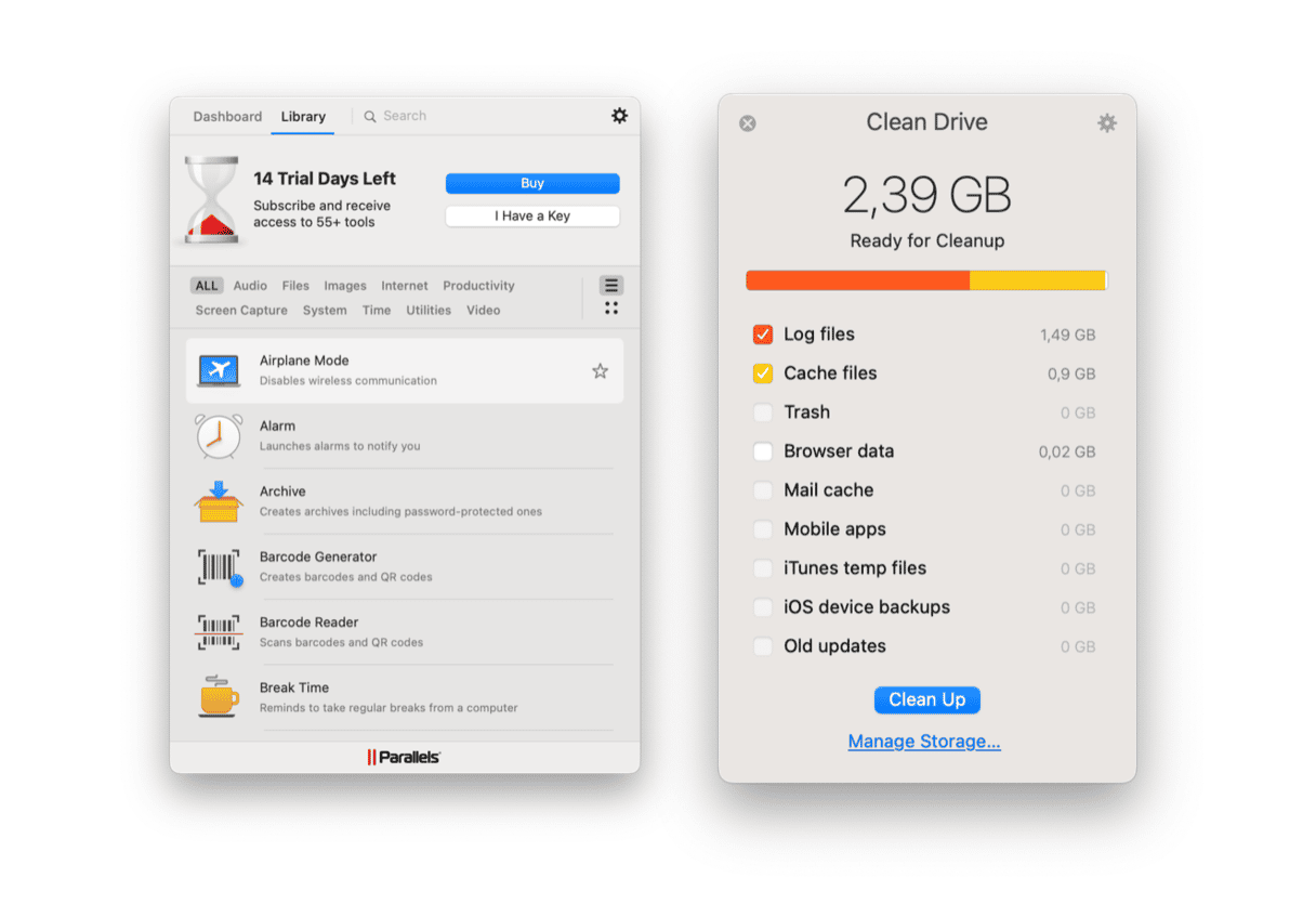 Parallels Toolbox er egentlig et sett med verktøy for din Mac. Den inneholder mer enn 55 verktøy som lar deg raskt utføre rutineoppgaver på Mac-en, for eksempel ta skjermbilder, ta opp lyd, stille inn tidtaker og rydde opp i stasjonen, blant annet. Med tanke på mangfoldet av tilgjengelige verktøy, er Parallels Toolbox mer et optimaliseringsverktøy i stedet for en rengjøringsprogramvare.