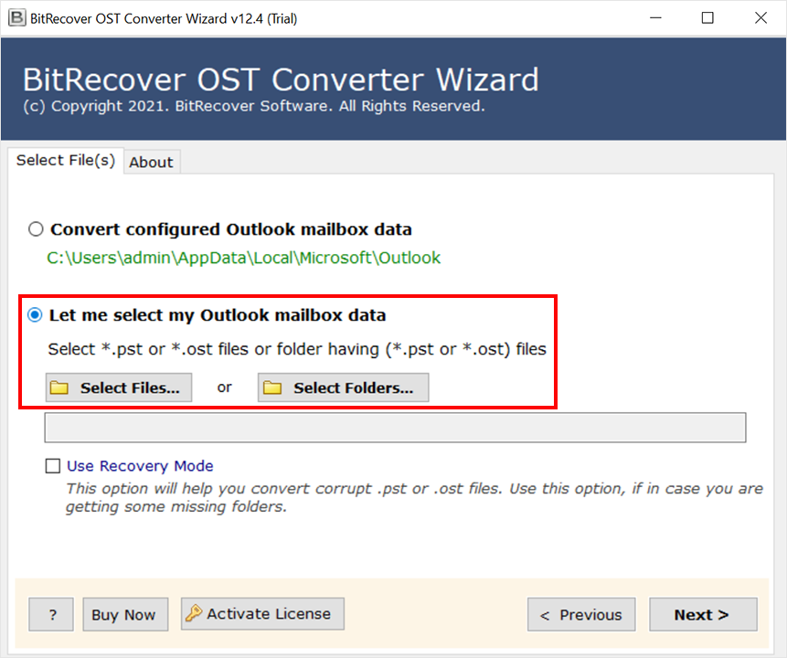 - Efter nedladdning och installation, kör verktyget och klicka påVälj filer...ellerVälj mappar...alternativet att välja OST-filer från din dator.