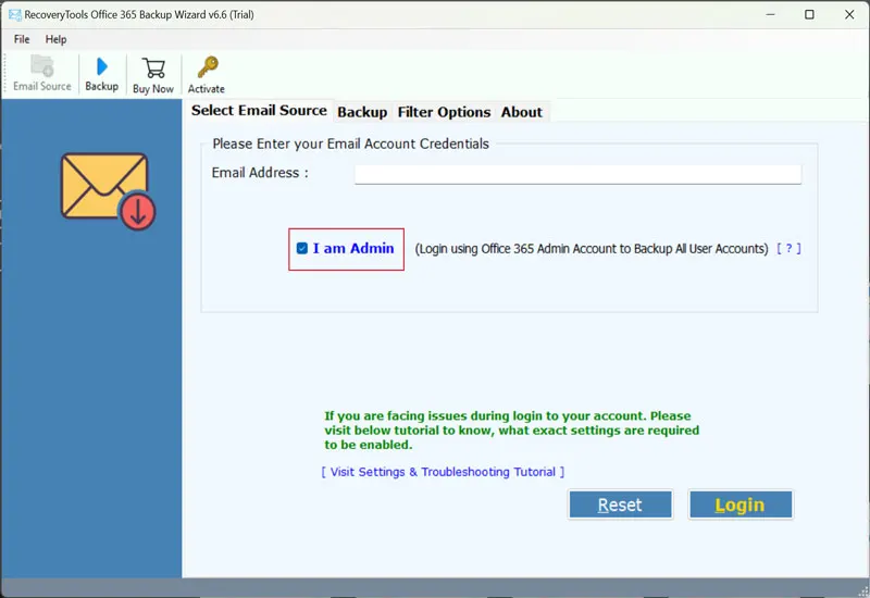 2. Ange din Microsoft 365-e-postadress. Klicka sedan på knappen Logga in. Glöm inte att välja Jag är administratör.