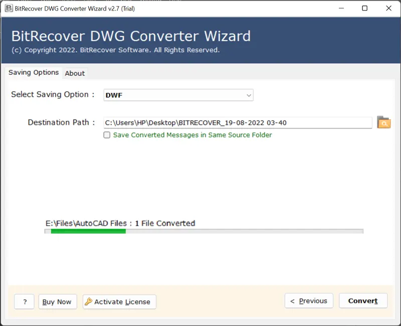 Ett av de mest pålitliga och välrekommenderade verktygenBitRecover DWG File Converterär ett måste för alla seriösa designers verktygslåda. Förutom att konvertera data i bulk eller delvis, kan verktyget göra mycket mer. Dessutom vänder den sig till en mängd olika konsumenter tack vare dess intuitiva och unika användargränssnitt.