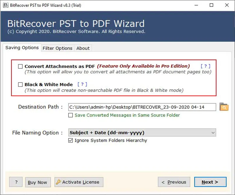 - Den har en funktion för att spara Outlook-filer i svartvitt läge. Användare kan välja detta alternativ om de vill ha sina filer i svartvitt format.