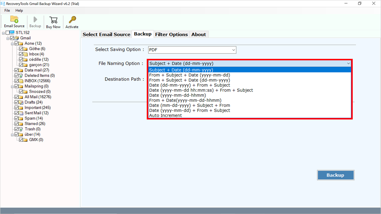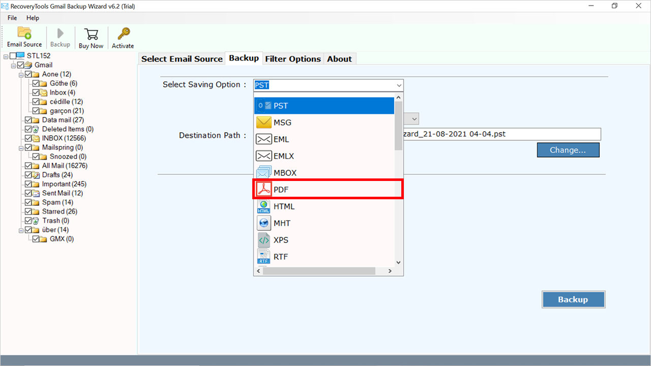 - Välj sedan "PDF" filformat från "välj sparalternativ" och klicka på "säkerhetskopiering"-fliken.