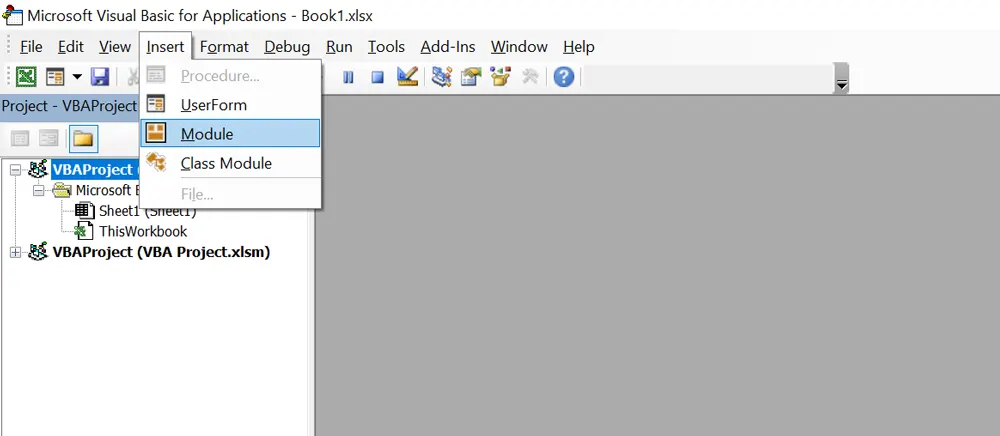- Klicka nu på Infoga och välj alternativet Modul från rullgardinsmenyn.