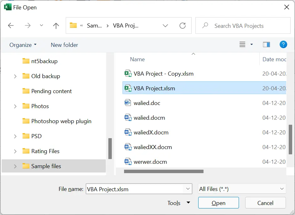 - Välj det lösenordsskyddade excel VBA-projektet från din dator. Tryck på knappen Öppna för att slutföra detta steg.