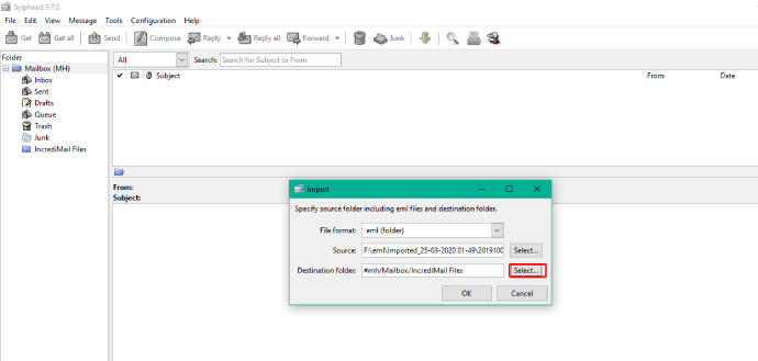 - Välj enplatsför att spara IncrediMail-data i Sylpheeds e-postklient.