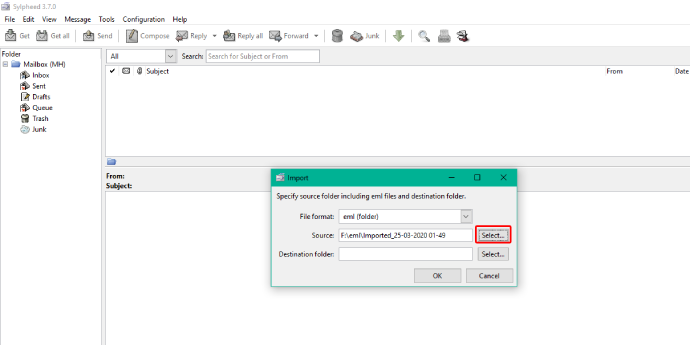 - Välj nu en målmapp i ditt Sylpheed-konto genom att trycka påVäljaalternativ.