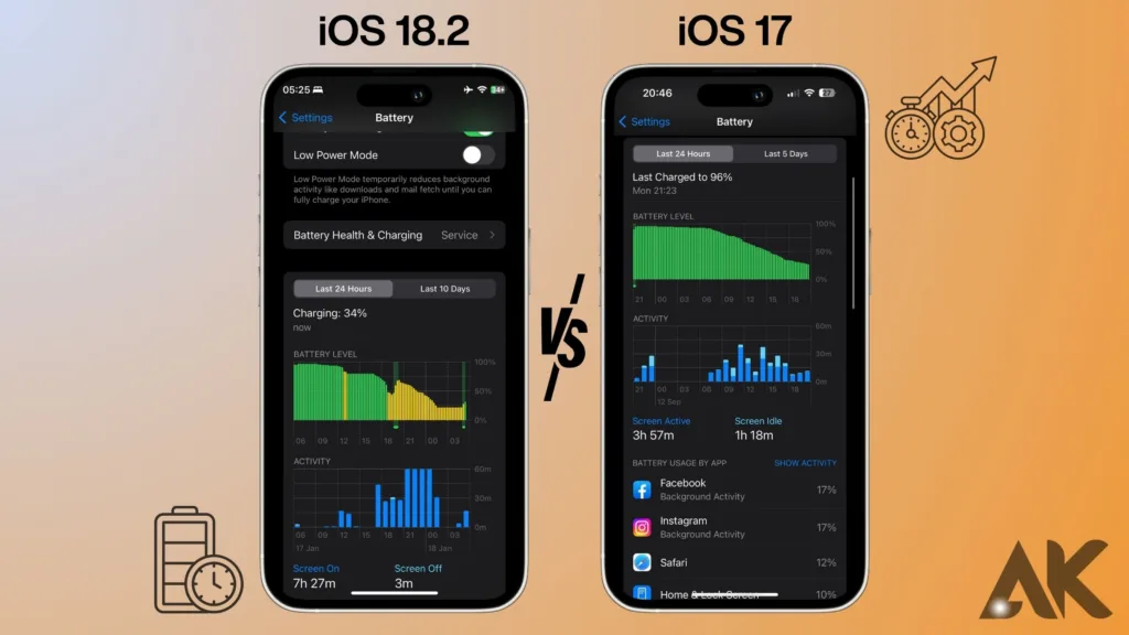 Till skillnad från sin föregångare tillförde [ iOS 17] större energieffektivitet; ändå saknade den kraftfulla maskininlärningsalgoritmer som introducerades i [ iOS 18.2]. [ iOS 17] använde fortfarande batterier bra, men för tunga användare är skillnaderna i [ iOS 18.2 vs iOS 17] när det gäller batteritid något tydliga. I detta avseende är [ iOS 18.2] en vinnare eftersom det inte bara ökar batteritiden på tidigare enheter utan också förbättrar energihanteringen. Oavsett om du bara surfar eller använder kraftkrävande appar ser [ iOS 18.2] till att din smartphone, särskilt vid långvarig användning, använder mindre ström än den skulle göra med [ iOS 17].