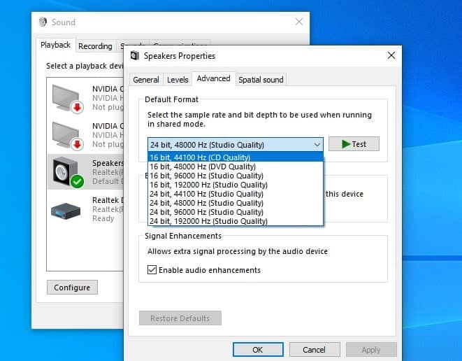 Flera användare på Microsofts forum har rapporterat att de åtgärdat felmeddelandet "ljudåtergivningsfel, vänligen starta om din dator" genom att endast ändra ljudformatet. Du kan försöka ändra ljudformatet på Windows 10 genom att följa stegen.