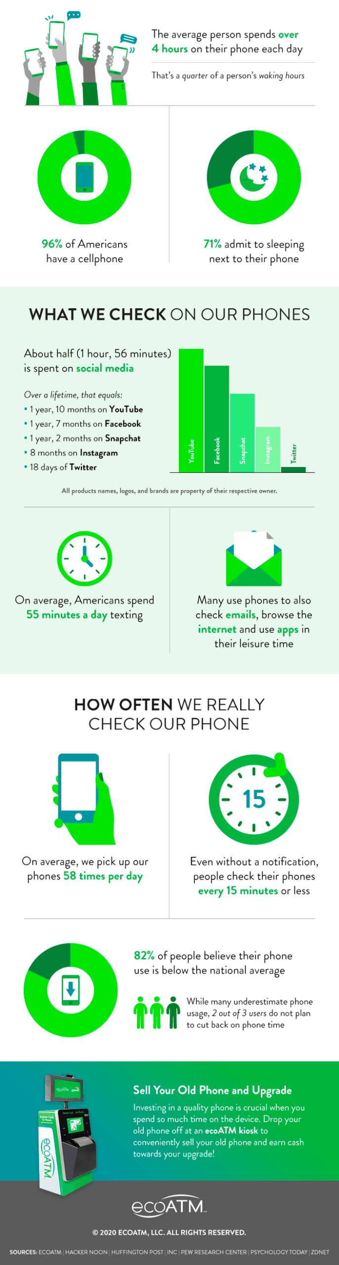 För de flesta människor är vi aldrig mer än några meter från vår mobiltelefon. Hur mycket tid spenderar du på din telefon varje dag? Har denna statistik fått dig att besluta dig för att använda din smartphone mindre, eller planerar du att uppgradera din nuvarande enhet så att du kan använda dina favoritappar för sociala medier snabbare? Om det senare är din plan, glöm inte att göra detkolla in ecoATMnär du är redo att byta in din gamla telefon.