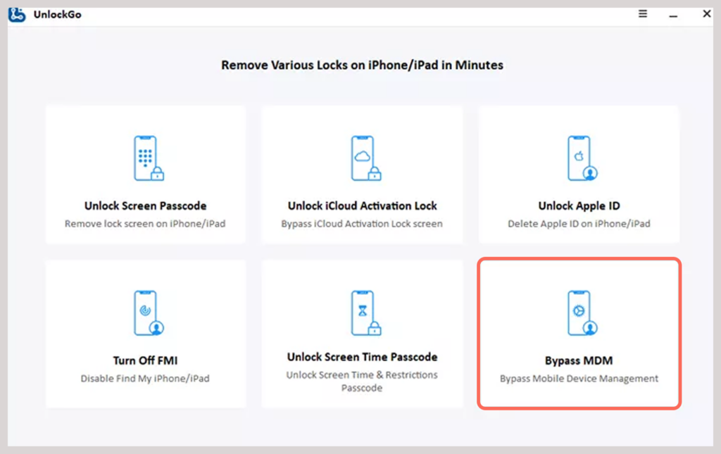 Besök iToolab-webbplatsen och ladda ner UnlockGo iPhone Unlocker (itoolab.com/unlock-iphone) på din dator. Öppna programvaran och anslut din skolutfärdade iPhone eller iPad med en USB-kabel. På hemskärmen väljer du "Bypass MDM" och klicka på "Start” för att påbörja förbikopplingen.