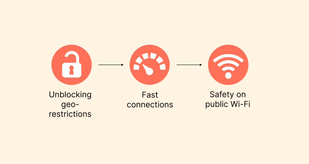 - Säkerhet på allmänt Wi-Fi: Internet är fullt av dåliga skådespelare, och ett felklick kan få dig i trubbel.Offentligt Wi-Fi anses vara ett ökäntjaktmark för hackare och andra dåliga skådespelare. En VPN skyddar dig från bedragare på offentligt Wi-Fi genom att kryptera din data, vilket gör den otillgänglig. Några andra toppfunktioner, som en kill switch och DNS-läckageskydd, säkerställer din säkerhet och integritet på offentligt Wi-Fi.