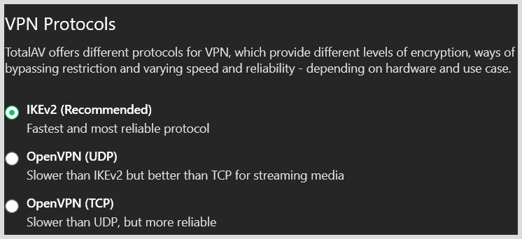Under tiden, den inbyggda Total VPN-versionen i TotalAV-antivirussvitenstöder endast OpenVPN- och IKEv2-protokoll. Även om de fortfarande ger robust kryptering, är de inte lika snabba eller effektiva som nyare alternativ som WireGuard.