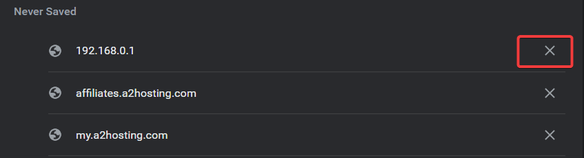 6. Leta upp webbplatsen från listan och klicka på "X" bredvid den för att ta bort den från "Aldrig sparad” lista.