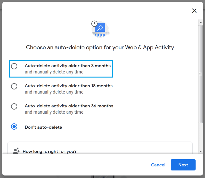 Det finns ett alternativ att ta bort alla sökningar på Google automatiskt. Det här alternativet är idealiskt om du inte gillar tanken på att manuellt radera data varje gång du använder Googles tjänster. Det ger dig lugn att veta att ingen data samlas in och lagras av Google. Men om du vill behålla vissa data bör du undvika den här funktionen.